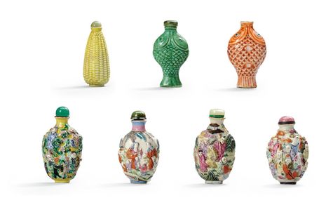A311 胎黃釉玉蜀黍形鼻煙壺 A Yellow-glazed Porcelain 'Corn' Snuff Bottle A209 A208 A207 A201 十九世紀 瓷胎粉彩凸雕鼻煙壺 Famille Rose Molded Porcelain Snuff Bottle, Late 19th Century A408 瓷胎礬紅雙魚形鼻煙壺 An Iron-Red Decorated Porcelain 'Twin Fish' Snuff Bottle B1006 瓷胎綠釉雙魚形鼻煙壺 An Green-glazed Porcelain 'Twin Fish' Snuff Bottle