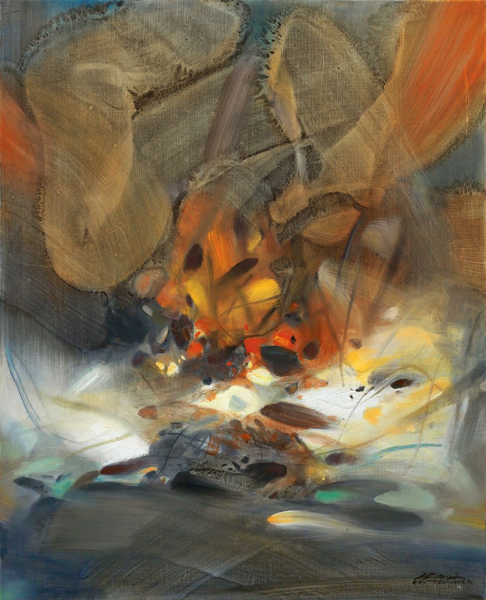 此幅1990年的《冥想》,濃郁實在的大地色澤佈滿畫布領域,其他清淡爽朗的色澤則一絲絲地探出 頭,色調即使沒有明確外形的包裝,朱德群做到讓它們 仍有各自的神韻氣質,顏色本身就是一種暗示。而畫面中央的明亮色塊有如早期「寶石時期」閃耀一般的瑰麗畫面,及意境深遠。色塊和筆觸的堆疊向上方層層推進,婉延攀升,構織出一個光影幻化的意境,充滿了空靈、冥想的幽靜氛圍。渲淡氤蘊間微光折射,渾然天成的澄澈詩意,瑰麗色彩與線條如交響樂章般彈奏,蓄著炙熱宏大的力量。帶給觀者藝術家內在詩意的泉湧。