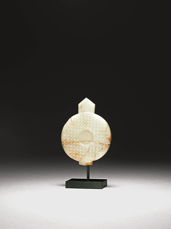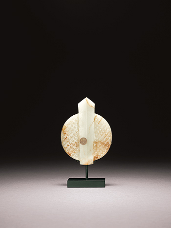 玉做板片狀,局部有褐色沁斑。通體琢一圓形璧壓疊於玉圭之上,璧的上下廓露出圭身,另一面可見玉圭的完整面貌,璧肉滿飾浮雕排列規整的穀紋,玉璧的「好」孔則以減地表現。圭、璧皆是古代玉器中的禮器,兩者原本各有各自的功能,而玉璧合一則是後代對上古時期的摹古創新,是一種具典雅氣息的把玩雅器。
