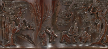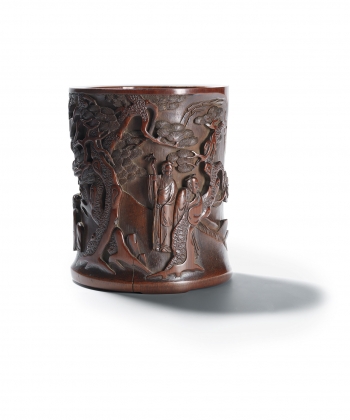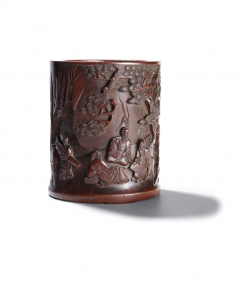The cylindrical bitong finely carved in high relief with two bearded scholars, one of which holding a walking cane behind the gnarled branch of a pine, with another three scholars nestled in a terraced lush garden setting engaging in leisurely pursuits, one leaning on a stack of brocade books, the others with a scroll in their lap and holding a brush, two attendants appear next to them holding a qi, all amidst pine trees and rock works.