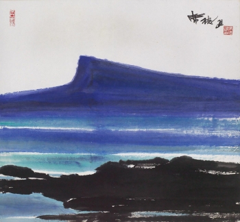 此幅《藍色海岸》兼具有水彩畫與水墨畫的特色。他打破了中國水墨畫的皴、染、輪廓的構圖原則,以水彩畫的著色方式,使彩墨畫顯得活潑有朝氣,以具現代感的極簡風格描繪淡水河畔宜人的景致。