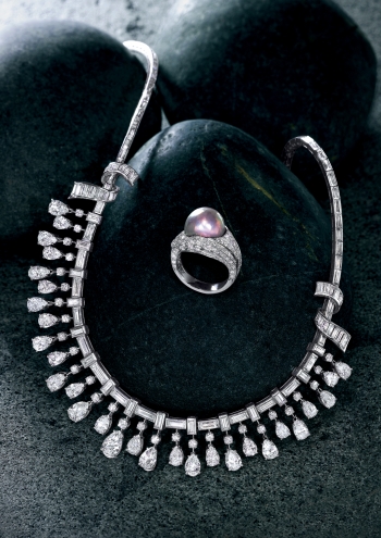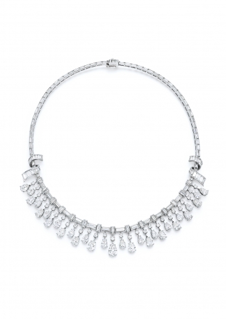 The front section, designed as a row of baguette-cut diamonds suspending a fringe of pear-shaped and brilliant-cut diamonds, to the baguette-cut diamond scrolled spacers and backchain, mounted in platinum, 39.5 cm long