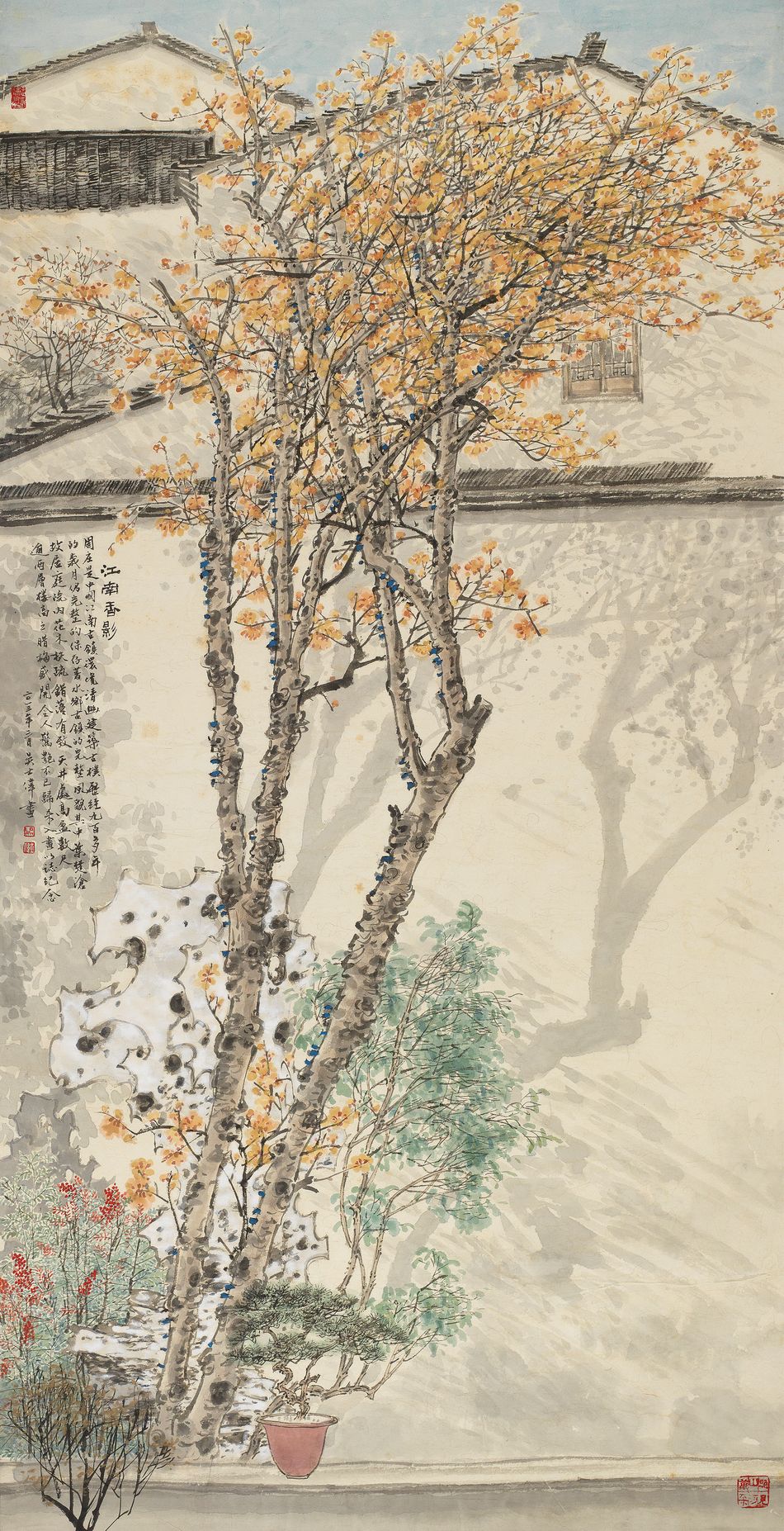 釋文:江南香影。周庄是中國江南古鎮,環境清幽,建築古樸,歷經九百多年的歲月仍完整的保存著水鄉古鎮的完整風貌,其中葉楚滄故居庭院內花木扶疏,錯落有致天井處高盈數尺逾兩層樓高之臘梅盛開,令人驚艷不已,歸來入畫以誌紀念。