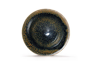 此盞撇口,呈現斗笠形,小圈足,碗內通體施黑釉,釉中含有鐵元素,高溫燒制過程中,呈現鐵銹色不規則分佈在盞中,猶如浩瀚宇宙,給人帶來無限的遐想。盞外施黑色鐵銹斑釉至盞身的三分之二處。此種鐵銹斑為宋代磁州窯創新的裝飾手法,宋金時期足見此種釉色工藝已經被成熟掌握,鐵銹斑這種釉色更為宋人所喜愛。