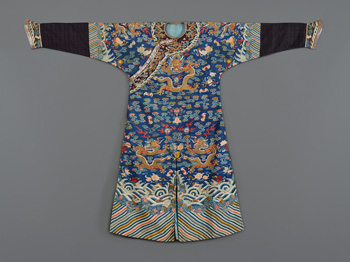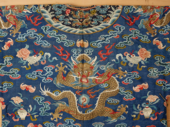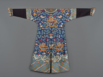 圓領右衽,前後開裾,衣袖加中接袖,馬蹄袖端。天藍色緙絲面,天青色紗裡。石青色素緞接袖,五彩雲蝠金龍領袖邊,飾銀錦緣。袍身前後及兩肩各飾一正面金龍,下襟飾四行龍,裡襟緙行龍一,合為九龍。龍紋之外間飾紅蝠祥雲暨八吉祥紋,紅蝠祥雲寓意洪福齊天,下幅飾海水江崖紋。是件緙絲龍袍配色淡雅,清麗和諧,所緙技法嫻熟,圖案清晰莊重,為龍袍中的精品。