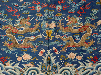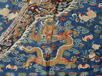 清道光 藍地緙絲金龍彩雲紅蝠八吉祥海水江崖紋龍袍