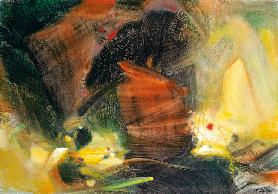 In the 1980s, Chu Teh-chun had fully used lines, dots, and rough strokes in Chinese calligraphy and painting. The pitching, pause and transition, strokes and brushes in Chinese calligraphy could be found in his works during this period. By the late 1980s, Chu Teh-chun inclined to use natural light in his painting for deeper interpretation and tried to put more colors into picture. He adopted a more extensive and emotional creative way to extend the spirit of Chinese culture. He has also put rich colors into his creative works, which shows affluent and sentimental feelings. "Vibrations lumineuse" created in 1986, is depicted in a dynamic layout with delicate fabric, accurate beauty and extreme expression. The painting shows the jumping rhythm with power. The dots and blocks seemed like symphony performance, integrated with the fluency of Chinese cursive writing and the Western rhythm of visual aesthetic.