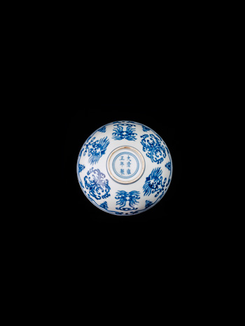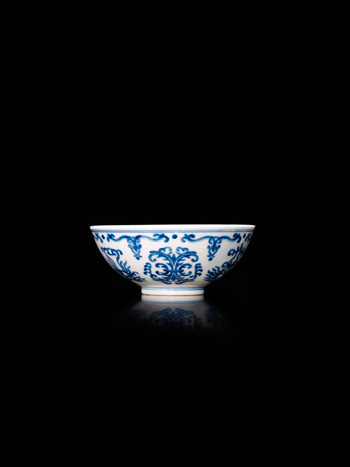 敞口,弧腹,腹下漸收,圈足。口沿外與近底足處各飾兩道青花弦紋,腹壁上端飾一圈芝草紋,其下繪六組忍冬紋。底書青花雙圈「大清雍正年製」雙行六字楷書款。通體青花發色淡雅,所繪圖樣筆觸流暢,布局對稱疏朗,又忍冬紋具「延年益壽」的吉祥寓意,處處顯露雍正朝娟秀雅致的美學風尚,誠為青花美器。
