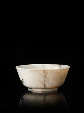 玉質或因經火燎緣故而呈現鈣化現象,通體呈乳濁色,牛毛紋滿布,局部有黑褐色綹線。是碗撇口,深弧腹,腹下漸收,圈足,底面署「乾隆年製」雙行四字隸書陰刻款。是碗外型大器,簡約凝練,具有濃郁的宮廷氣息。