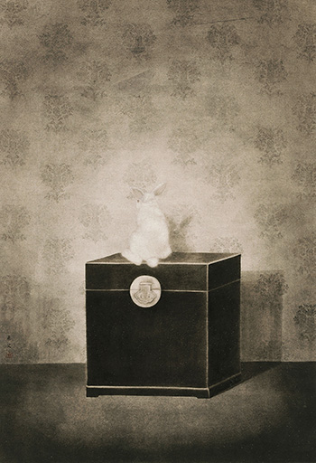 《百寶箱之嫦娥》畫中玉兔以背影示人又放置在畫面的正中,強光照射形成焦點,形成中間明亮、四周黯淡的格局,給人特別的感動,雖有種疏離、又冷暖自知的味道。兔子站立於一個質樸無華的極簡單的木箱子之上,箱子則是以個人私藏的意象出現,顯現出女畫家私密性的體驗,去除了滿足個人興趣的修飾或許反而能準確傳達畫家的意圖。箱子上古舊的圓鎖其實也是象徵個人心理的一種投射,正如人所說那把鎖頭像一個圓月,與兔子互為推映,更切「嫦娥」之題。作品明暗深淺的墨色和筆觸在宣紙上構建了千百年來中國文人的夢圓和夢碎。宋畫元素情懷呈現出別樣的趣味,經過她的拼裝,有點詭異,但詭異得抓人眼球。