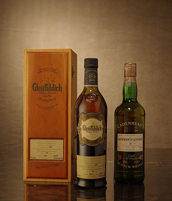 除了知名的常見酒款,Glenfiddich 的老年分酒款在市面上並不多,尤其是單桶裝瓶或者獨立裝瓶廠的裝瓶更是少見。此次蒐集到多款Glenfiddich,從獨立裝瓶廠Cadenhead 裝瓶的1963 年,1965 年份款,與跟Wedgwood 名牌合作的21 年白瓷瓶雕花款,都是早年發行的作品。