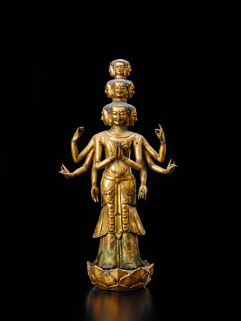 觀音菩薩九面八臂,身著圓領通肩長袍,腰束長裙,袍衣貼體。胸前與裙面垂掛華麗瓔珞,雙手當胸合十,其餘六臂呈左右對稱排列。長裙下露跣足,立於三層仰式蓮瓣座上。是件觀音立像,體態曼妙修長,八臂曲線柔美,為觀音八臂化身的精品造像。