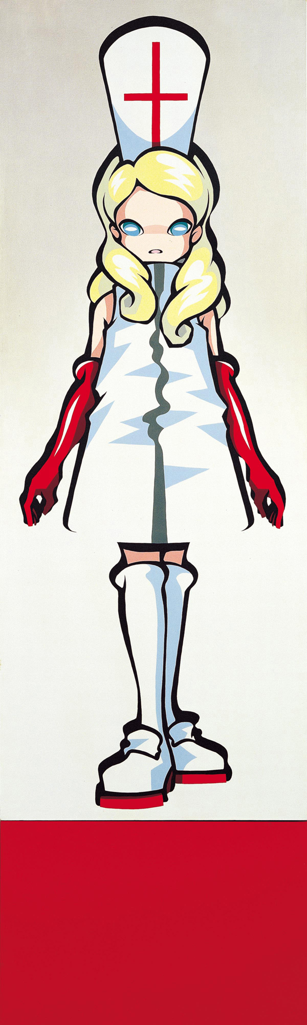 平面设计师出身的松浦浩之,99年开始创作具动漫特质的"角色"图样,取材动漫中元素制作压克力绘画,对艺术家而言,许多年轻人混淆了现实世界与动漫画虚构世界,导致不善于和他人互动或表达个人情绪,甚至某些群众认为动漫画只属于儿童,松浦浩之的作品也挑战这样的成见,并解放之中的可能性及人们的内心意识。《奥菲莉亚》、《小护士》爽朗的用色、精确的色块区隔,人物悬浮般的姿态,彷佛电影停格诱导观者想象情节的衍生方向。