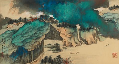 1974時年56歲,此時的孫雲生專心於潛修,此作則描繪了池上秋冬之景,畫中近遠,在描繪霧靄於巒山間的層次與距離中,筆帶色跑,未乾暈染,遠山似霧靄繚繞,暈染、勾繪若即若離,潑彩處濃淡相間,乾以濕出,在宋代《林泉高致集》山水訓四法中的瀟灑,石青石綠的潑彩渲染,在濕筆中濕的堆疊,表現山水中氤氳煙濛,此作中的潑彩丹青,揉攪彩泥,略帶濕度下破開潑彩中雲霧,濃淡有序的去滲染,淡彩寫至前景,讓人感受到畫面的透明感,在細細勾繪出巒山與山村間遠近賓主的層次,濃蔭的雲霧肆意於層巒疊嶂之間,筆致飄緲,全在煙雲,崖中點出紅葉,十月秋樹紅葉苔點皴,落葉清舟,人聲與共。