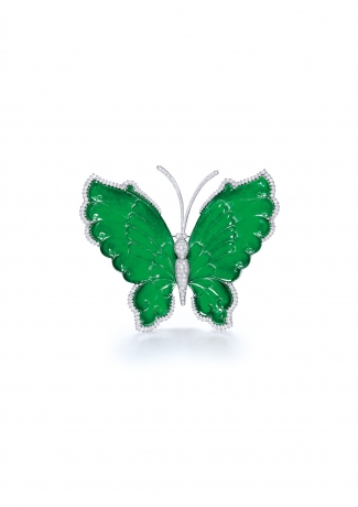 The wings set with two carved jadeite plaques of bright emerald green color and good translucency, enhanced by brilliant-cut diamond trims, to the pavé- set diamond body and brilliant-cut diamond antenna, mounted in 18k white gold, largest jadeite plaque approximately 59.6 x 27.7 x 1.2 mm, 7.5 cm wide