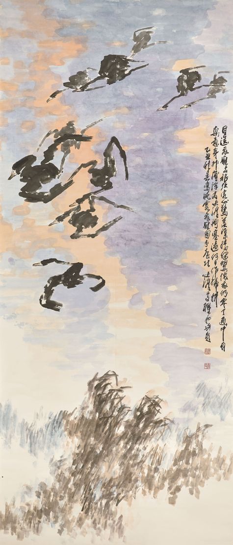 此畫形簡意深,簡單的筆劃,帶出非常豐富的意境。夜幕漸臨,晚霞帶上一抹緋紅,自然濃淡的顏色層次襯托出烏黑的鴻雁,更為畫面添上憂鬱的思念情懷。黑雁龐大健碩的身軀與瘦長的脖子形成強烈的對比,黑雁引頸眺望遠方,彷彿隱含著歸家的期盼。對比平展翱翔的姿態,藝術家選擇了描繪曲折的翅膀,彷彿描述鴻雁使勁起飛,對抗沉重的地心吸力,卻又充滿活力。金石風格甚為濃厚,轉折頓挫、剛健蒼勁的線條,帶有篆籀古樸挺拔的筆勢。畫面佈局簡單而細膩,下方柔細的蘆葦隨風飄拂、疏密有序,平淡卻突顯出上方十隻強壯的黑雁。