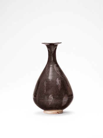 撇口,長頸,溜肩,垂腹,圈足。通體施黑釉,黑釉上局部點綴褐彩斑,底足不掛釉,露出灰白色胎。全器以典雅的釉色與柔美的造型引人目光,尤其是玉壺春瓶的美妙弧線變化,更讓人有百看不厭的視覺享受。H: 27 cm