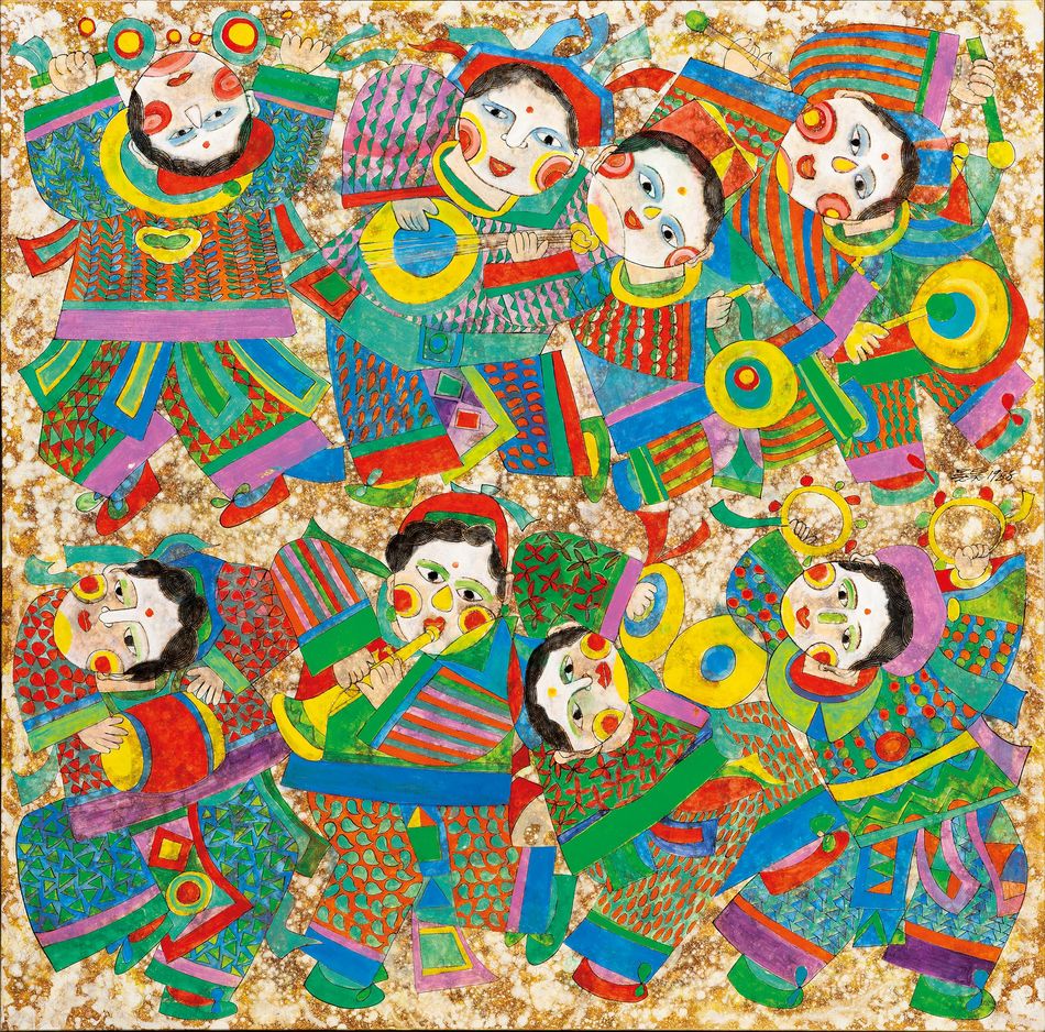 饒富意象的民俗樂隊喜慶場景,藝術家以方形構圖,