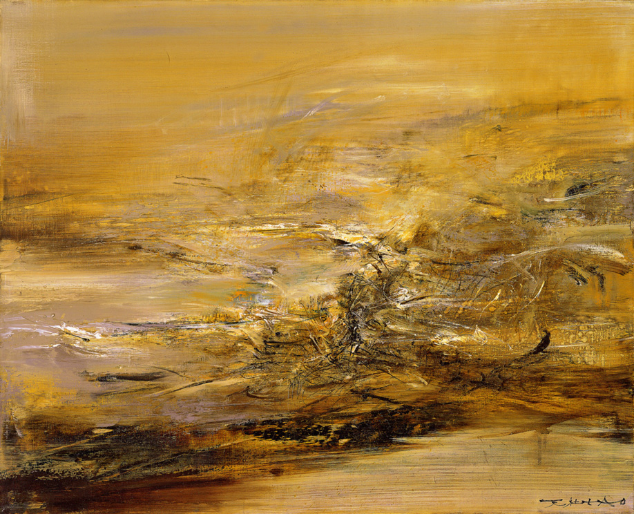 趙無極的畫意進入詩的領域,進入自然宇宙的探尋。《21.3.1964 》這幅畫以黃色、棕色、黑色筆觸交匯而成,快意奔放。詩人葉維廉認為看趙無極的畫,「彷彿獨立在舞台的邊緣,聆聽色澤與線條在那裡演奏演出」;「像杜甫讓雲滌盪在雄奇雄渾的胸懷裡」。這恰是符合杜甫的詩「胸盪生層雲」的意境呢!