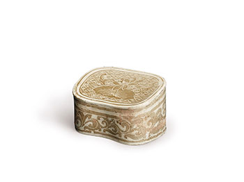 枕形腰圓形,枕面前低後高,通體剔花裝飾;枕面為一朵荷花與荷葉,脈絡清晰,荷花與荷葉周圈環繞波浪紋,素底無釉。從製作工藝上看,剔花系先在胎上施化妝土,然後勾勒出花紋輪廓,再在紋飾上刻畫葉脈,最後剔去紋飾以外的地子,形成白地襯托淺褐色花紋。引領了定窯瓷枕中一類新品種,開定窯瓷器之先河。