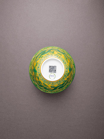 碗敞口,弧壁,深腹,腹下漸收。全器內、外壁做黃地綠彩裝飾,碗心一道綠彩圈紋內飾一楷書「壽」字。外壁近口緣處繪兩道平行綠彩弦紋,兩弦紋內繪二方連續捲葉紋,腹壁繪雙龍趕珠紋,近底足處飾一圈如意雲肩紋。圈足內施透明白釉,中央署釉下青花「大清道光年製」三行六字篆書款。