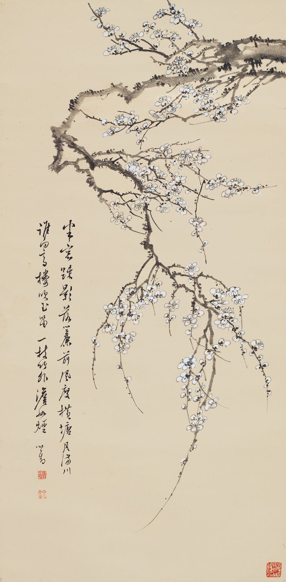 梅是文人雅士喜愛描繪的花卉題材之一,溥心畬是近代少見的飽學之士,其自詡以書法入畫,用詩文鋪陳胸臆風景,為畫壇公認、絕俗超塵的文人畫家。此幅《梅花》以簡潔的筆法構成,筆鋒枯澀、行筆快速強勁,寫古梅自畫幅右側上方凌空岔出、一氣呵成,沒骨用筆爽健,揮掃出勁奇的主枝幹,旁枝用籀篆之筆寫成,以方筆起筆露鋒猶如綿裹鐵、不露圭角,行筆至細微處如蠶吐絲,筆勢流轉且帶抑揚頓挫;佈局採用偏倚的平衡形式,細觀雖處在靜態之中,但卻能給予視覺上變奏排列的效果,溥心畬寫梅 花以一枝帶雙花、多苞的形式佈局,善用圈筆鉤寫梅瓣、細筆點蕊描脈,後用白粉敷色,盡寫一派白梅盛放之姿。此畫藉由梅花粗礪的枝幹、雋永的花朵配置、花型的漸變與交錯產生出律動感,呈現出輕快豪放且活潑生動之感;作品整體風格酣暢蕭散,墨色不掩筆意、點畫分明,可看出溥心畬直取古人筆墨為上的企圖,用筆既收放自如又能呈顯梅花的天然風貌,不求形似而重意境,老株白梅的蒼勁嶙峋油然而生,其筆力凝鍊更可直追元人筆意,畫中行草題詠梅詩句,寄寓己身品格孤高的情懷;溥心畬渡海抵台後便潛心書畫用以抒發心懷,藉畫梅作為其內心不隨俗浮沉的註解,實為溥氏經典傳世的寫意花卉名作。