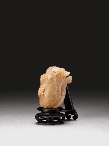 整料壽山石雕成,通體呈淺黃色,做白菜一株。根部圓圜,菜葉層層包裹,葉脈分明,刀法簡練,形象逼真。白菜上飾有數隻螃蟹啃食果葉,可謂增添白菜的盎然生機。白菜的圖像一般有清清白白的寓意,若再加上螃蟹的意象,或許更有清白傳家、和諧守業的美好寓意。H: 7.7 cm
