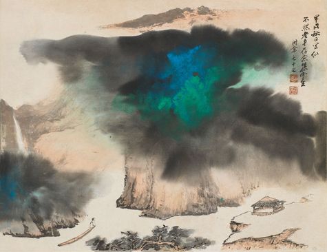 自六零年代西洋的美術觀點進入台灣,產生第一波思潮的撞擊,一直延燒到九零年代,1994年孫雲生受國立歷史博物館之邀開授國畫班教學,台灣美術在學術發展上,也在此時進入多元的發展面向,而這件潑彩也正是在這樣的一個背景下所作,此幅以彩為主心,再用墨色以濕筆破染開來,畫中寫溪山秋霽,以潑彩潑墨描繪雨後初晴之景,山中水氣蒸騰,雲霧繚繞,赭色淺降帶出山稜層次,雲霧如薄紗罩於面望不穿,上寫下工,在細筆勾繪下,延伸出潑墨雲霧之景,畫中一高士承舟遊溪的心境,正如孫雲生先生寫生,盡收此景於紙幅為一呈現,晚年孫雲生於教學上多著墨,潛心修習時,也在這大時代的環境下延續大風堂的神韻傳承。
