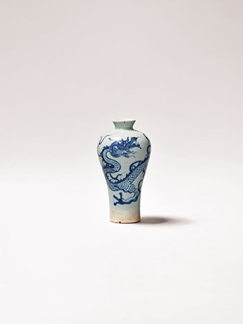 小圓口,短坡頸,頸壁內斜,豐肩,腹下漸收,圈足。通體施白釉,掛釉不及底部,全器以釉下青花裝飾紋樣,腹壁繪行龍,行龍轉頸回首,鬣法向後飄飛,形塑行龍向前飄動的速度感。全器線條優美,行龍形象輕盈,是一件清新洗鍊的元代青花小品。H: 13 cm