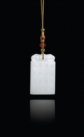 Of rectangular form with ruyi-shaped clouds bordering the top, worked with the scene of He xiangu sailing on a raft with a basket in front of