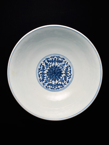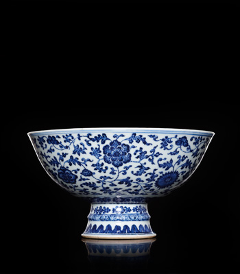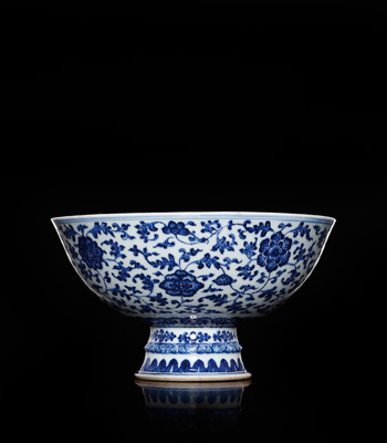碗敞口,弧腹,下承外撇高圈足。通體釉下青花裝飾,外壁口沿外飾兩道弦紋,腹壁繪纏枝花卉紋,高足中央起凸弦紋,弦紋上飾二方連續捲雲紋,弦紋上飾折枝花卉,弦紋下飾蕉葉紋。整器畫工精美,青花發色濃豔,為青花瓷器中的典雅之作。