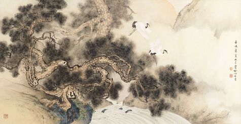 《松泉鶴舞》為喻仲林少見全景式、山水松禽之珍品,佈局以奇踞盤桓的古松為題,佔滿畫面主要的視覺地位,此佈景法脫自南宋馬麟《長松山水圖》及《靜聽松風圖》,兩者皆以突出誇張的松樹形體作為主軸,山水流泉與仙鶴則成旁襯,通幅設色溫雅,用色清麗。畫幅兩岸夾江河局面,左方喻氏以長筆折帶皴畫山石,石青分層套色,是青綠山水中用於罩染突出部位的山石典型畫法,再以焦墨點苔,點綴雙鉤夾葉,敷以花青作出層次;江水則填細筆描繪淡染,間雜河中岩石更顯水流動感;右側彼岸與遠山隨雲霧繚繞而隱蔽,均用澹墨敷染,施以點苔,盡顯江河水霧罩籠的迷朦感,左右取出輕重平衡,寓工筆於寫意,觀之彷彿無盡,姿態萬千。前景雙鉤古松拔地竄生,形態盤錯糾纏,松枝轉折險奇,筆法前後嚴謹,以主幹帶雙枝;松幹以圈筆畫樹瘤、赭色輕染;細筆落松針如氈球,畫五球為一叢,疏密之間更見蒼碧勃發的張力,又以水色作渲染擴散,突顯松樹主體的量感與力度。後方沒骨畫松,以寫代細,石綠汰染的松針叢,如在煙雲中飄渺,喻氏雖擅工筆,然其寫生意到筆不到,隨意點染,更得自然造化的神妙機趣。中幅畫有仙鶴一對橫江飛渡,喻仲林用工筆白描鶴形翅羽,尾羽、頸頰則以淡墨多次暈染析分層次,朱磦染頂,腿部鱗甲勾墨,濃淡相間;雙鶴掠翅高飛於古松之上,神態自若,彷彿舞於天地之間,對照留白的雲霧更顯幽遠古意,再體現出顧愷之所謂「以形寫神」的風貌。