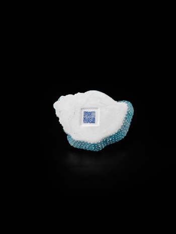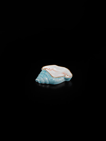 The palette is well formed in the form of a shell, decorated with minute raised bosses in simulation of the texture of the shell, covered in pale blue glaze with misty red strikes on the interior of the well, the base inscribed with the six character reign mark.