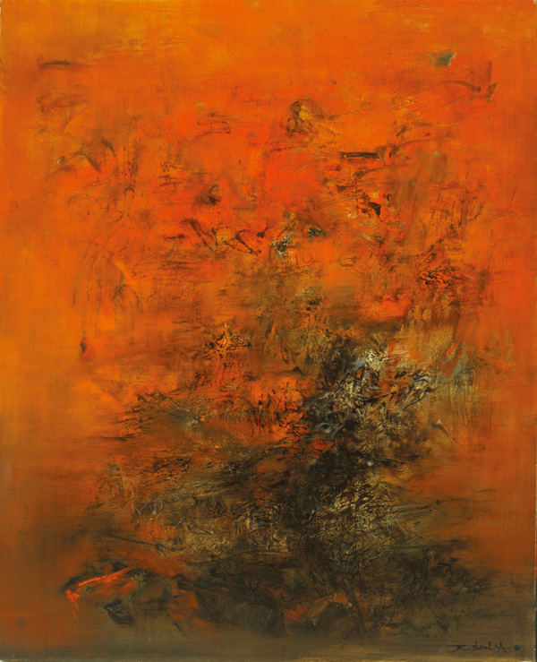 作品《12.04.60》以橙紅色為背景基調,運用黑褐色的激烈筆觸,或凝結,或舒緩,充滿力度,整體畫面極富律動感。他的自然胸懷已經超越媒材的限制,完成了油彩不易達到的優游移動、濺射,完成了水墨不易達到的厚實凝結。兩種截然不同的文化感受,竟然可以在同一幅繪畫裡自然地馳騁。在這幅畫裡50年代常見的符號早已昇華,化為不具形象的刷痕、線條。尺幅之間,猶如一個巨大的自然,觀者震懾於畫裡的氣象萬千,無意間墜入到畫中的交響詩裡。前景底部渾厚、堆疊的黑褐色,如積雲,不斷地追逐、生成,頃刻間翻轉為蒸騰向上的氣勢,疾騁而過的畫鋒,起伏跌宕,飛速間濺灑出乳白色霜點,如驟雨、如旋風;在氤氳飄渺之間、捲升的褐色,在穹蒼裡最後化成縷縷輕煙。