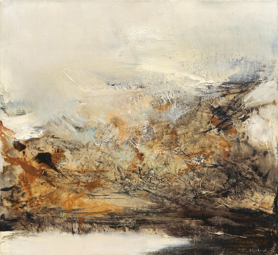 1957與1958年趙無極與好友蘇拉吉(Pierre Soulages)賢伉儷赴美旅行,接受紐約當代藝壇的熱情交流,並且與敲響時代大鐘,將戰後抽象表現藝術一舉推向歷史之巔,鼎鼎大名的紐約庫茲畫廊簽下合作,定期在美國舉行畫展。趙無極的藝術挾帶強大豐沛的能量,從1959至1972年進入人稱「狂草時期」的巔峰階段。趙無極的「狂草時期」猶如開天闢地,象徵於革新和傳承間闊斧前行,一幅幅波瀾壯闊的傑作起於藝術家義無反顧終生探索繪畫的再造。早年藝術家刻意迴避,以免自己因技藝精湛,落為匠氣的深厚書法技巧,在此時已經化繁為簡,於表象中割捨傳統元素的窠臼,精煉出宏觀於天地,萬物合一的內在自然。創作者的狂喜、憤怒、平靜、無為之情,經由抽象空間與色彩交織,毫不隱諱的表達出來。畫中撼動人心的非凡氣勢,來自創作者自幼耕耘,熟捻的西畫技巧和悠遠的東西文化底蘊,兩者迂迴纏綿,終得開花結果。「畫室是隱蔽的盒子狀,這是我的意思,光線只從北邊來,有點灰,永遠穩定,使我能掌握每個色彩的密度,不致讓日光扭曲了色彩的細緻變化。」《趙無極自畫像》第七章節今次拍品《18.10.68》完成於1968年。此作宛如太極圖象構圖,舉重若輕,虛實相生。墨色線條鐵畫銀鉤,曲折於前景帶起律動;背景遠眺則如雪山白雲浮隴於山道,黃石嶔崎磊落吹以冰藍皴擦筆觸絲絲入扣。趙無極長期接觸西方傳承的美學思惟,他巧妙的把西方特有的光線感,融入創作之中。畫中表現出的莊嚴光輝耀性,及其奇幻神祕的華麗色彩空間。畫家以瞻精獨到的筆觸,轉譯生命之氣、風、動力、形體的展開與融合。力量與平衡,虛實間瞬息萬化,從感覺出發的繪畫,進入空間的對話。趙無極的法文自傳裡,第一句話就是提到他的父親:「我的父親逝世於1968年,正值文化大革命。」1968年時趙無極早已經揚名異域多年,卻苦於1949年後中國的重大歷史轉折,一直無法順利回鄉探視父母。另一方面正值壯年的畫家,情海中深情也失意,美麗妻子美琴飽受疾病所折磨,他將其擔憂鬱悶化為力量,以創作抒發,任思緒馳騁於筆鋒的競逐。光陰飛逝,留下情意綿長與意志昂揚,一幅幅扣人心弦之作。