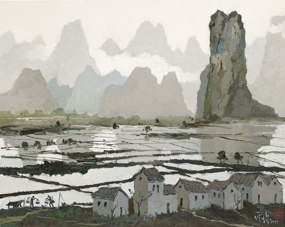 作品《山影映水田》同樣融匯了中西方的藝術哲思,是一幅飽涵中國詩詞文化,且有豐富知識學養的難得佳作。全景式構圖,描繪了桂林一帶的魚米水田之景。遠處的山影朦朧如淡墨渲染,筆法可見宋代畫家屈鼎《夏山圖》的神色在其中。畫面由遠而近作平遠之貌,千山一碧,水田蒼茫。再跟隨視線前移山勢漸陡,彷見林木蔥鬱,雲霞鎖山腰,山形步步移。近山步入眼簾,山形奇美瑰麗,酷似元人吳鎮《秋江漁隱圖》中山石的韻味——蒼茫渾厚的山水畫風,恰到好處地表現了古人歌頌山川之氣韻。筆端豪邁的氣質亦是其師黃賓虹從新安畫派的疏淡清逸,轉開學習吳鎮的黑密厚重的積墨之風格,對之後龎均在傳統技法上的影響可見一斑。