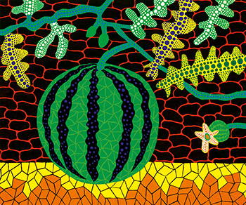 草間彌生認為自己跟其他藝術家不一樣,她會以自己的心理狀態與創傷作為藝術主題。《西瓜》正充分反映了草間自小面對的視聽幻覺與精神病困擾。佈滿畫面的線條與鮮艷的底色形成了強烈的對比,令人聯想到草間的「無限的網」系列。網線猶如裂紋一樣,讓畫面充滿馬賽克的效果。草間以平面的方式繪畫簡單的西瓜圖案,而水果上大小不一的圓點則為這些圖形增添立體感。《西瓜》雖然有斷裂的感覺,但網線與圓點又把整體畫面連接起來,顯現藝術家透過藝術創作來治療精神病的過程。