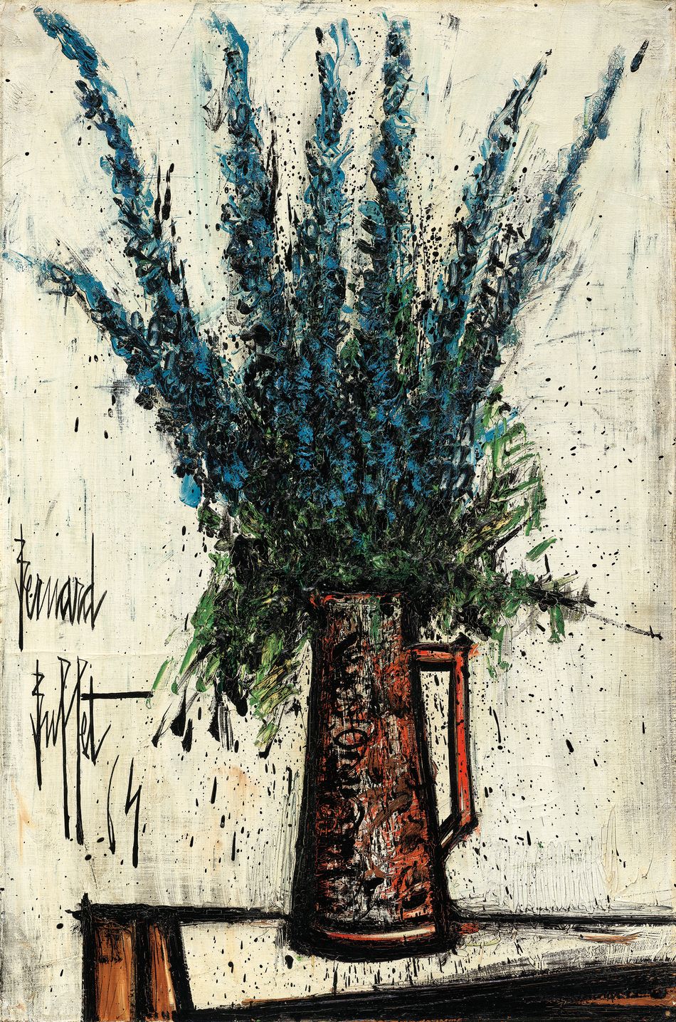 1957至1964年間,畢費與妻子安娜貝爾(Annabel Buffet)定居於普羅旺斯的弓之莊園(Le Château l' Arc),這段歲月成為藝術家創作生涯中的黃金時期。南 法的明媚陽光與豐饒景致,緩解了他早年畫作中瀰漫的陰 鬱氛圍,使筆下題材轉向生活感與情感溫度兼具的靜物與 花卉系列。 《藍飛燕》不僅呈現畢費在造型與構圖上的純熟掌握,更 象徵他個人生命中一段恬靜而充實的篇章。花瓶中飛燕草 的挺拔與生氣,既是對自然的讚頌,也是對人心信念的映 照。透過這件作品,觀者得以窺見藝術家從孤寂的內省者 蛻變為對生命充滿熱情的詩人,展現出他在戰後現代藝術 史中獨樹一幟的美學高度。