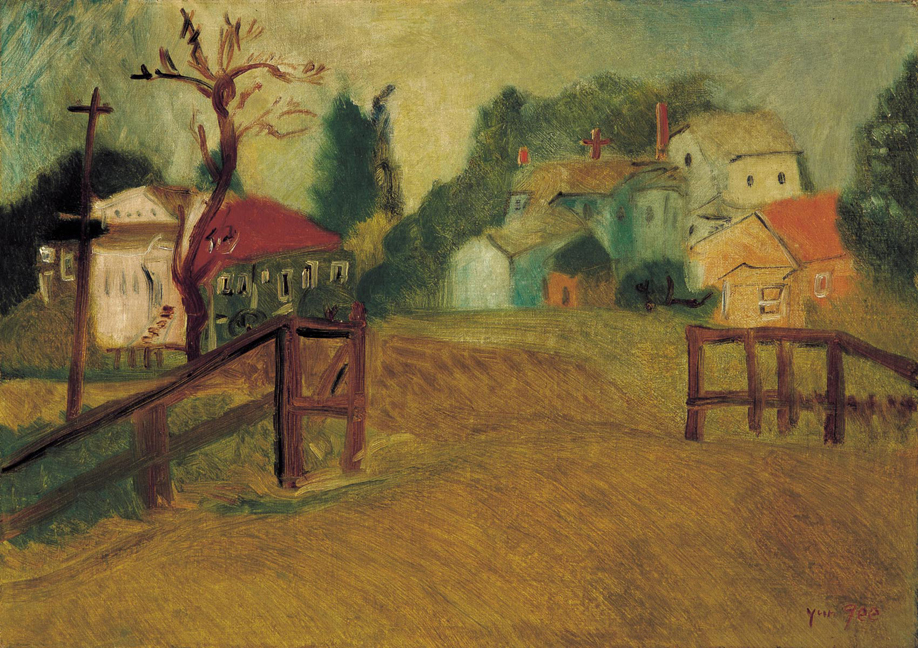 Yun Gee loved and excelled at landscape paintings, and he would often visit New York's Central Park to sketch from life. The result were a number of paintings showing New York vistas throughout the changing seasons of the year: rowing boats on the park's lakes and ponds, riders on horseback, and other scenes of leisure and recreation frequently appear in these works. The smallest of the four pictures from the "Pelham Bay" series, "Country Landscape", shows a farmer pulling a horse cart between wooden fences, but both the man and the cart are only adumbrated with faint lines, giving the composition a somewhat unfinished feel. The larger-format one, "Returning Home" (also titled "Farmer in the Wagon") shows a farmer riding a horse cart, and this time the man's features and contours are executed in a much more detailed and complete manner, putting the painting's focus irmly on the figure instead of the surrounding scenery. "Farmers' House", on the other hand, is clearly a more poetic rendition of a bucolic panorama. In all likelihood it was completed during the same period that saw the creation of the other two paintings described above, that is between 1930 and 1940.