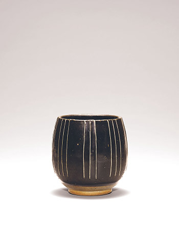 圓口微斂,深弧腹,腹部至底部急收,圈足。通體施黑釉,掛釉不及底部,露出灰白色胎,圈足旋削規整,腹部有八組做三條平行排列的縱向出筋線,筋線呈白色,在黑釉的襯托下尤顯明快俐落,典雅大方。
