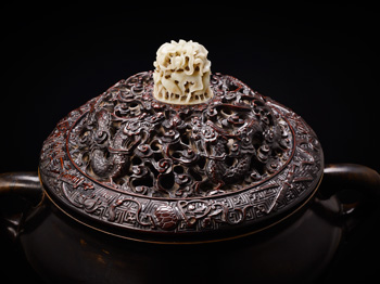 Of compressed bulbous form resting on a flattened circular base, flanked by loop handles on the waisted neck rising to a gently flared rim extending to the patinated interior, the plain body extends to a patinated interior, the reticulated cover decorated with four five-clawed writhing scaly dragon in full flight amidst dense swirling clouds rendered in openwork, encircled with a band of the eight emblems against a ground of keyfrets on the outer rim, surmounted by a jade finial exquisitely worked to the scene of egrets perch next to an blossoming lotus with its head gently lifted up in a graceful posture, the base with the six character reign mark within a slightly sunken square cartouche.