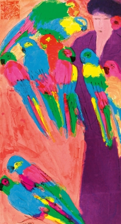Fong Leng 是華裔荷蘭籍的時尚女性設計師,全名為Carla Maria Fong Leng Tsang,華文姓氏曾。1937年出生於鹿特丹。她的設計作品常以絲綢為素材,取中國風主題如豹的圖騰,風格華麗、戲劇感。她與已故荷蘭社交名媛瑪蒂爾德.威林克的合作最為著名。1984年Fong Leng也曾經為Levi’s設計平價牛仔服飾,其創作於多家荷蘭博物館收藏。Fong Leng於1974年起收藏此幅《女人與鸚鵡》,為類似的仕女題材中極早的一幅創作,其華美且具異國情調風格與女設計師的品味貼近。