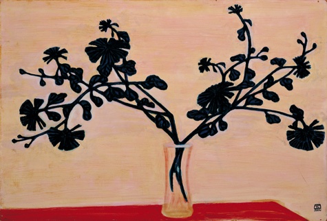 The lowers and vases from this phase are usually outlined with thick strokes, and colors and composition are kept terse, giving the paintings a certain naive charm that is further enhanced by the freehand brushwork. In his later works from the late ifties and early sixties, the coloring suddenly becomes mottled, brighter and