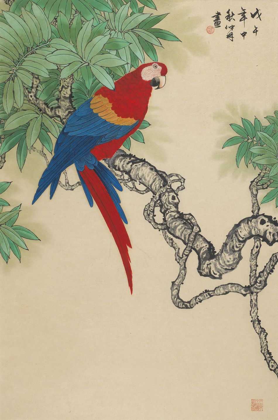 款識:喻仲林《翠藤紅羽》,戊午初冬。