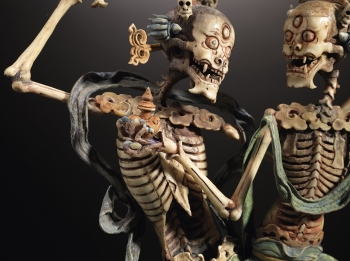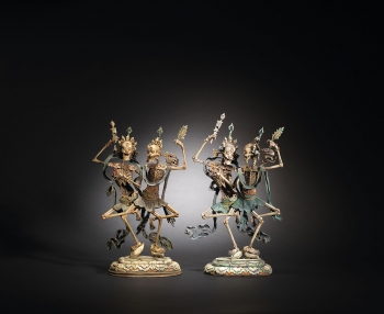 In essence, Cittipati are often referred to as the lords of the funeral pyre and the Tibetans regard them us benevolence deities. According to their belief system, the connotation behind a skeleton may not be entirely negative, as death entices one to contemplate upon the concept of impermanence and simultaneously prelude the cycle of reincarnation. The rarity of the present lot predicates upon the meticulous details of the figures elaborate headdress and drapery, which are connotative of the prestigious status of the dancing deities. According to popular Tibetan folklore, the Cittipati performs the Tsan dance on the cremation ground and this is an important subject matter often depicted on the monastery paintings in Lhasa and other sacred Tibetan art. For instance, it is depicted in an important Yama-offering thangka (Fig.1). The two skeletons, presumably Citipati, dance as they circumambulate the choten. Compare with two other thankas featuring the two deities and dated to the Qianlong reign (Fig. 2 and 3), currently residing at the National Palace Museum, illustrated in Thangkas of the Palace Museum, The Complete Collection of Treasures of the Palace Museum, Hong Kong, 1996, pl. 42 and pl.43, pp. 48-49.