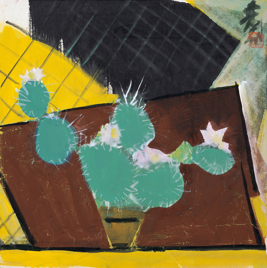其中,仙人掌是表現比較多的素材。而該作品同其他更偏寫實的用水粉色繪製的仙人掌的花卉靜物畫不同。這幅仙人掌那一瓶被綠意漲滿了的仙人掌不像是瓶子裡長出來,倒像是自顧自地跑來,臨時停靠在小瓶上,展露身姿,表現儀態。優雅,又因為背景色塊的對應,產生強烈生機的勃發感。而藝術家簽於右上角的簽名搭配整體的畫面形態,更給了畫面以額外的和諧和統一。