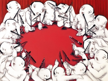 畫中人物環桌而坐,眾多麥克風分立於人物面前,仿佛是在開會議事。眾多的麥克風,象徵著每個人物皆可暢所欲言。他們神情姿態各異,或聆聽,或辯論,或憧憬,或凝思,呈現著詳和民主、和諧平等的氛圍。