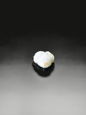 Carved from high quality white jade, the paperweight is dotted with brown spots and comes in the original wood base. The piece is made up of three lychee plants with luxurious foliage and full, rounded fruit. A magpie stands upon the branches. The paperweight is often held in the hand as a plaything. It is an original and unconventionally graceful piece and the design of the magpies with three lychee is a traditional auspicious design, the xibao sanyuan. The sanyuan means “three yuan”, which refers to the jieyuan, huiyuan, and zhuangyuan. Therefore, xibao sanyuan is the perfect picture of success in which a person has obtained first place in the county, capital and country exams.