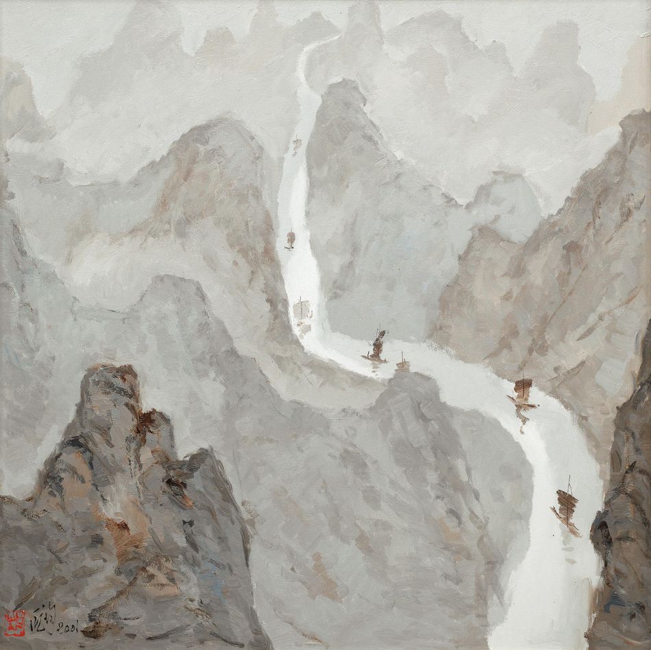 签名左下:龎均 2001手绘钤印:均签名题识:龎均 PANG Jiun轻舟已过万重山 2001