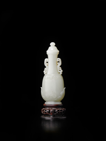 盖瓶整料和阗白玉雕成,玉质姣好,洁白温润。盖作覆式光素荷叶貌,近顶面处浮雕一圈莲瓣纹,顶上浮雕花蕾形为钮。瓶身修长,撇口起方唇,长颈,颈两侧透雕如意卷叶纹为耳。溜肩,扁圆腹,腹下近底部渐敛,下承束腰圈足。腹壁近肩处饰两道弦纹,弦纹下一圈如意纹。腹壁光素,惟近底足处,复以剔地技法,浮雕四瓣云肩如意纹,云肩如意纹像一朵盛开的花瓣,擎托起整件盖瓶,全器设计新颖,具有张力十足的美学造诣。